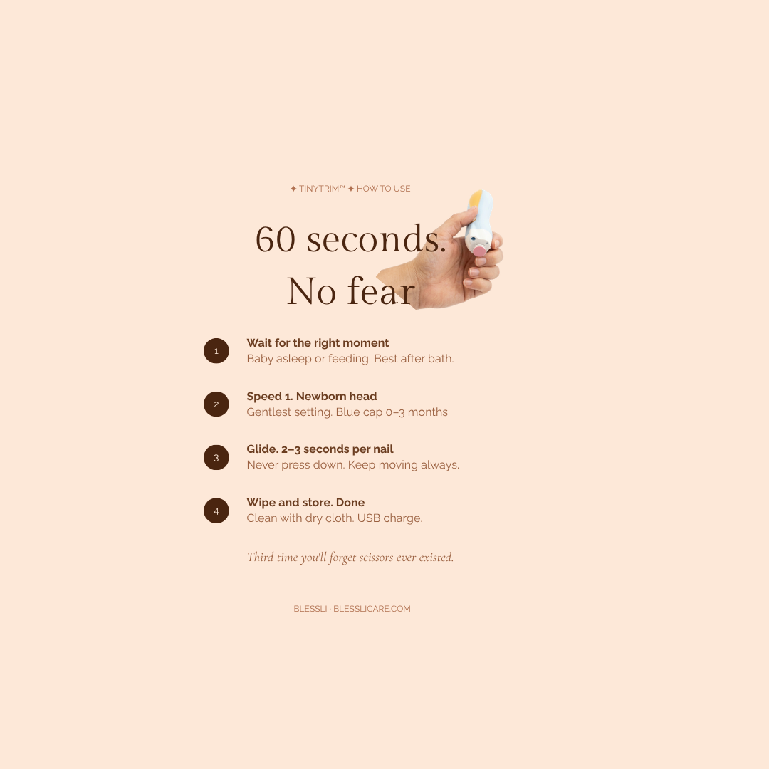 TinyTrim™'s whisper-quiet motor was designed for the moments babies are still. No startling. No crying. Just done.